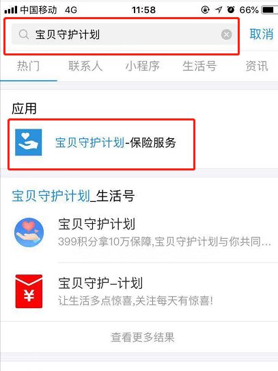 1,打开支付宝,在导航页面搜索宝贝守护计划,点击进入