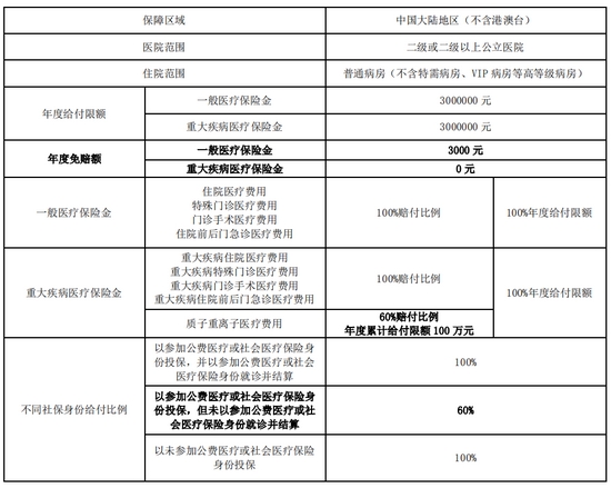 其中,年度给付限额分别为,一般医疗保险金300万元,重大疾病医疗保险金300万元;免赔额通常分为两种,一般医疗保险金免赔额3000元,重大疾病医疗保险金无免赔额。
