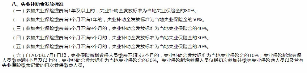 【6】自2020年7月6日起,失业保险新增参保人员缴费不超过3个月的,失业补助金发放标准为当地失业保险金的10%;失业保险新增参保人员缴费满4个月及以上的,失业补助金发放标准为当地失业保险金的30%。失业保险新增参保人员包括初次参加并缴纳失业保险费人员以及曾有失业保险缴费记录的再次参保缴费人员。