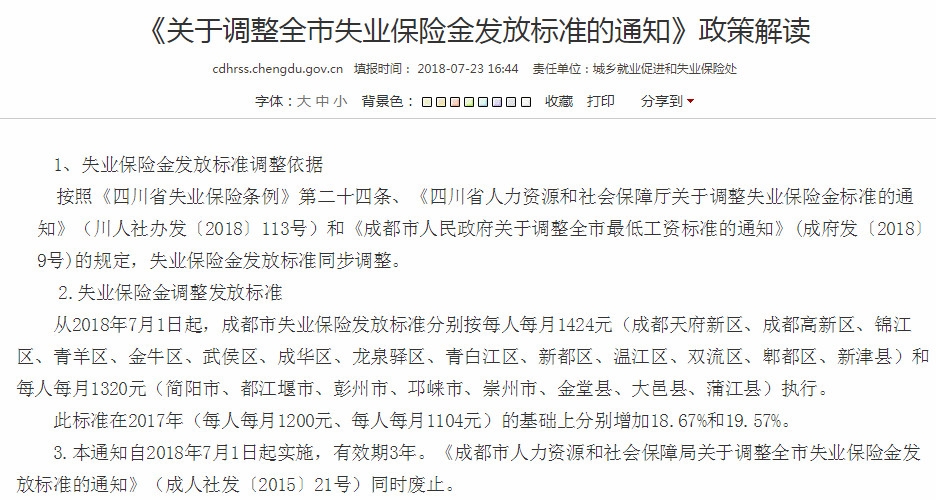 从2018年7月1日起,成都市失业保险发放标准分别按每人每月1424元(成都天府新区、成都高新区、锦江区、青羊区、金牛区、武侯区、成华区、龙泉驿区、青白江区、新都区、温江区、双流区、郫都区、新津县)和每人每月1320元(简阳市、都江堰市、彭州市、邛崃市、崇州市、金堂县、大邑县、蒲江县)执行。