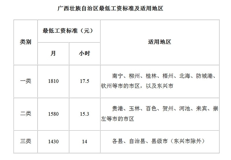 【3】各县、自治县、县级市(东兴市除外):最低工资标准1430元/月,14元/时。