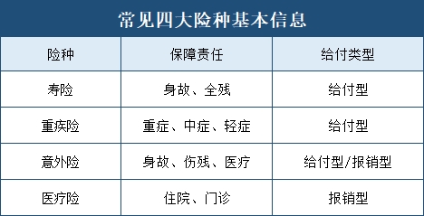 保障型保险的四大险种,也就是我们常说的寿险、重疾险、医疗险和意外险。