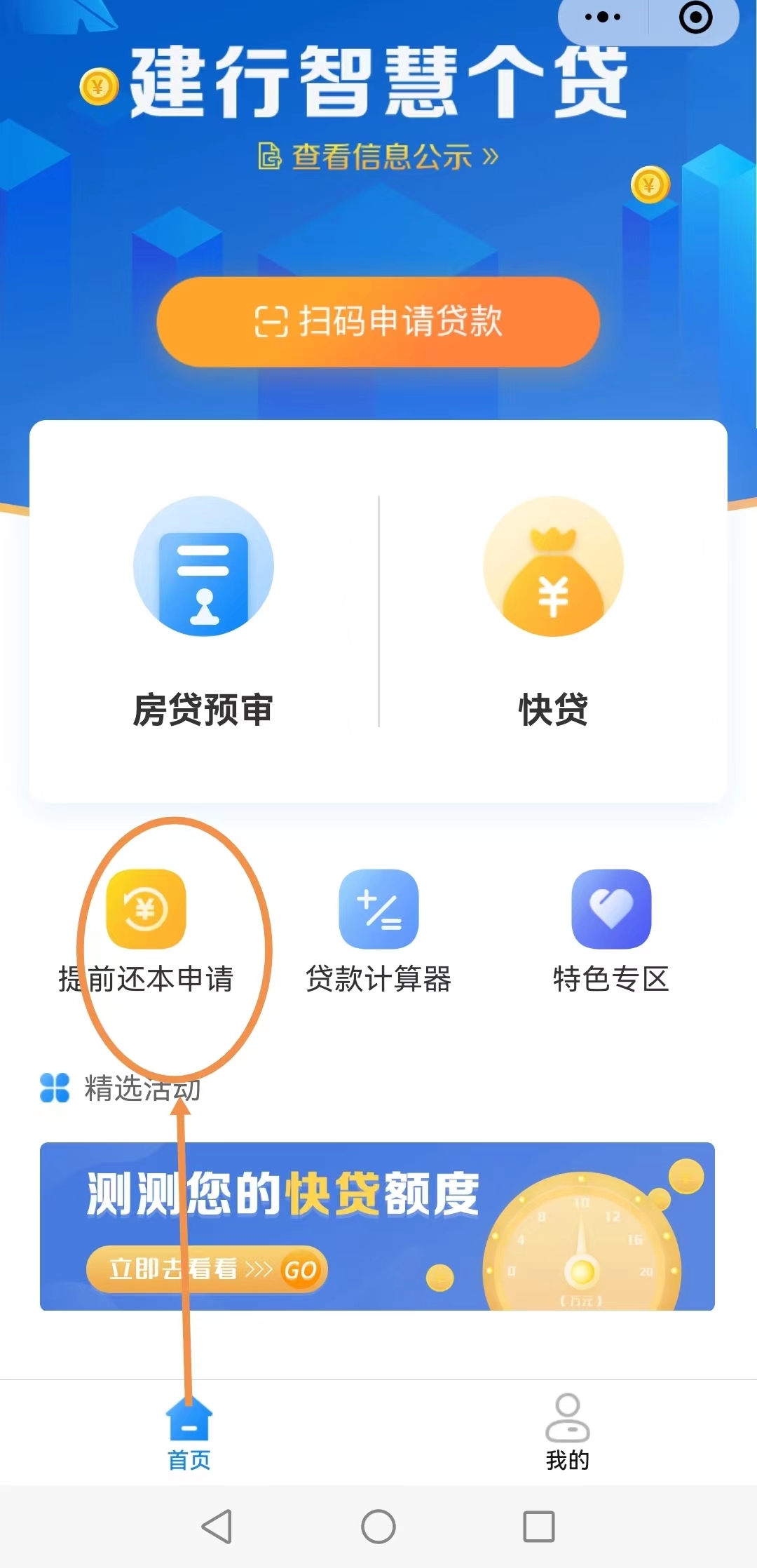 【2】线上办理。比如说,用户可以进入微信小程序“建行智慧个贷”,点击进去选取提前还本申请“即可。但要注意一点,目前湖北分行暂时未开放线上提前还贷渠道,且已逾期的贷款不可以办理提前还款申请。