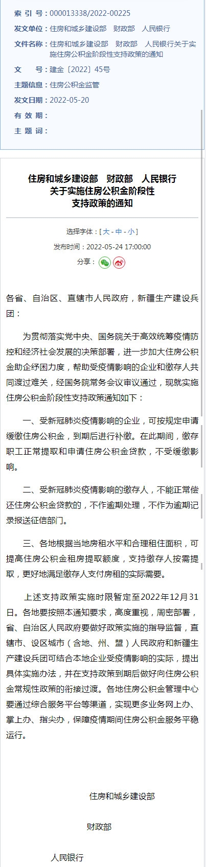 此前,我国多个地区都发布了关于住房公积金的新政,新政内容主要是增加公积金贷款额度以及下调贷款首付比例。而在5月24日,我国住建部、财政部、人民银行三个部门发布了《关于实施住房公积金阶段性支持政策的通知》,进一步增加了住房公积金政策的丰富度,下面我们来看看政策的具体内容。