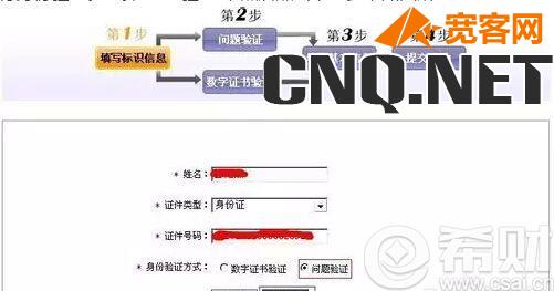5.填写上真实姓名,证件类型选择“身份证”,输入身份证号。由于该系统只提供两种身份验证方式:数字证书验证方式和私密性问题验证方式,所以,个人可以选择其中一种方式进行身份验证。选择“问题验证”,然后点击下一步,如图所示: