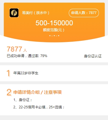 易美付是灵活支持大额小额分期贷款的口子,最高可以到15万元左右,如果周转不过来,可以最高分48期还完。审核门槛也不高,要求满18岁,个人网络信用分好。如果有其他资料辅助审核的话,审核会更快些。