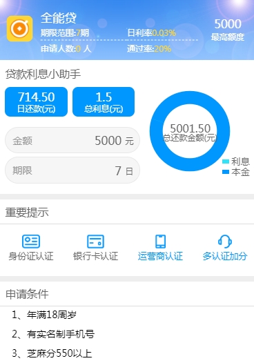 申请资料:身份证认证、银行卡认证、运营商认证、多认证加分