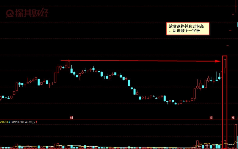 如图,我们可以看到该股在放量之后,随后四个一字板,个股强势氛围极强,总的来说,放量过顶这一K线的技术形态也比较好理解,一般放量过顶形成的特征有以下四点,第一是主力通常没有建好仓,只是因为时间有限,才会出此下策;第二是这类个股会被如此突破地建仓,往往意味着后市会有重大利好;第三是从放量过头之日起开始计算,到最高时的涨幅通常会高达50%以上;第四是这类个股的绝对价位不会很高,通常处于相对底部。