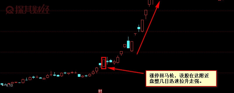 在我们实际操作中,一个股票涨停之后总是伴随着多个涨停,有些股票在涨停后,庄家在准备第二段行情,那么就会在涨停附近进行反复洗盘,随后再度拉升,杀一个回马枪,这就是涨停回马枪技术。