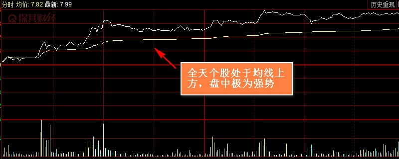 我们在个股中能发现一点,不少股票盘中分时图都会有一根黄色线,这根线会伴随着个股的上涨而上涨,这是盘中均价线。通常来说,股价站稳于黄色均线之上就是代表强势,在黄色均线之下就是弱势,上穿黄色均线就是走强,下穿黄色均线就是走弱。这个简单的判定就是个股盘中强弱的规则。