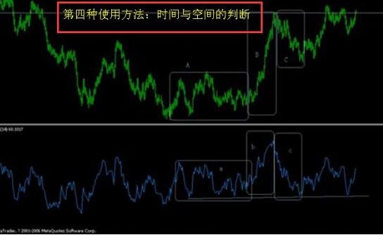上图中A与a区域为震荡市,rsi消耗的能量与价格一致;B与b区域为单边上扬,rsi未能跟随价格的上涨能量,但表现出同时到顶的迹象;C与c区域为单边下行,rsi消耗的能量与价格一致,但表现出同时到底的迹象。
