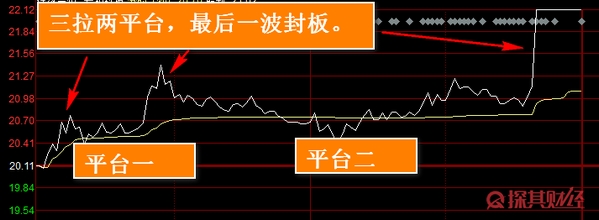 【2】第一个平台:庄家做这个休整平台的目的主要在于洗掉跟风盘,并进一步看自己控盘程度,最好还能卖出部分持股拿回拉升时用到的资金。一般来说,这个平台往往成交量非常之低,整个平台走的非常齐整,等庄家认为抛压差不多之后就会立刻展开拉升。