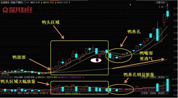 老鸭头形态往往是利用五日线、十日线和六十日线作为均线的参考,K线调整的位置作为鸭形态构成。所以当五日线、十日线放量上穿六十日线后,形成鸭颈部。回落调整的时候的头顶部便是股票的鸭头顶。股价调整一段时间五日线和十日线再度形成金叉便是鸭嘴。鸭鼻孔是五日线和十日线出现死叉之后又从新进入金叉阶段所形成的鼻孔。在这样用均线构筑之后,展示在我们面前的就是极为典型的老鸭头了。