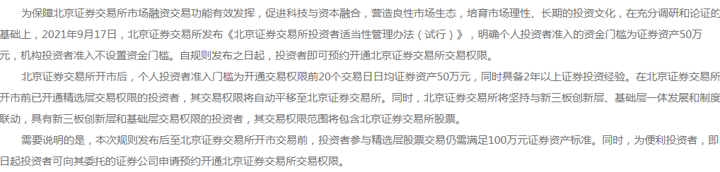 在北京证券交易所开市前已开通精选层交易权限的投资者,其交易权限将自动平移至北京证券交易所。同时,北京证券交易所将坚持与新三板创新层、基础层一体发展和制度联动,具有新三板创新层和基础层交易权限的投资者,其交易权限范围将包含北京证券交易所股票。
