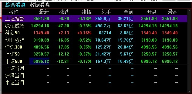 最新这一列数字是指数的具体点数,上图中上证指数最新点数为3551.99点,涨幅是上涨的百分比,上图下跌0.18个百分点。金额这一列是买卖股票成交的总的金额,是指当天截至目前一共成交的金额。