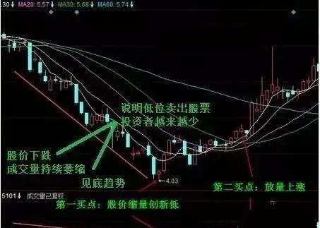 与放量上涨相反的则是缩量下跌,在股价持续下跌过程中成交量连续创出新低,就说明随着股价下跌,愿意以低价卖出股票的投资者已经越来越少,这种情况则往往是快要见底的信号。一旦成交量放大,多方力量进入,那么就可能开启上涨行情。