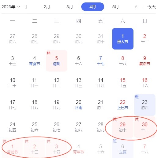 2023年五一股市休市时间是:4月29日(星期六)至5月3日(星期三),一共休市5天,但其实4月29跟4月30日属于周六跟周日,周末股市本来就是休市的,故而2023年五一股市实际放假时间一共是5月1日、5月2日、5月3日这三天,5月4日早上9:15分A股会正常开市。