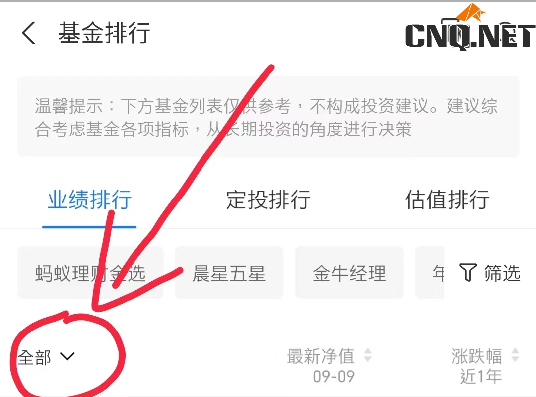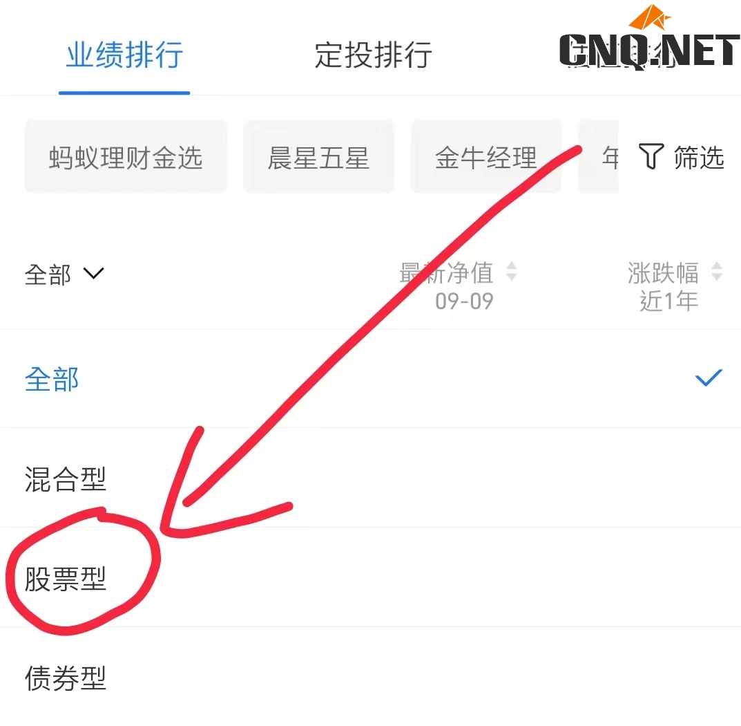 第五步、在基金排行页面点击全部并选择股票型,然后就可以选择自己合适的基金进行购买了。