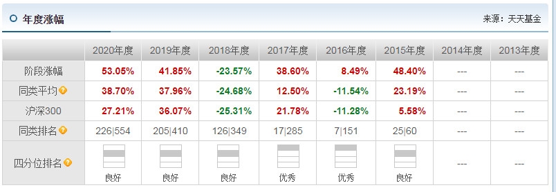 这只基金连续7年跑赢沪深300。陈一峰在2016年和2017年相对于市场来说表现最为出彩,大幅跑赢市场同类产品和沪深300指数。其中2016年实现收益8.49%,而同期股票型基金亏损11.03%,沪深300指数跌11.28%。2017年实现收益38.60%,同期股票型基金盈利16.22%,沪深300指数上涨21.78%。