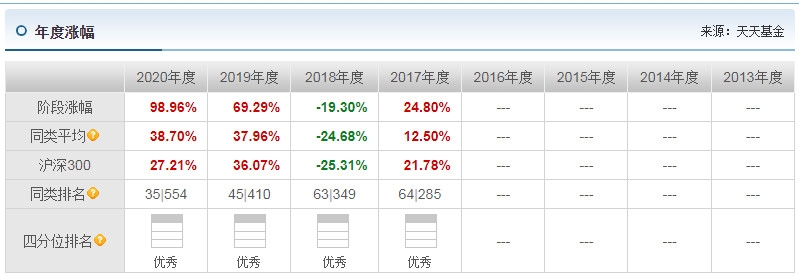 赵蓓基金经理在基金成立之后一直在管理这只基金,期间基金的业绩是非常突出的,收益率都跑赢沪深300指数和同类平均,其中2020年的收益率达到了恐怖的98.96%,这个确实非常优秀,而且很多机构都给予这只基金五星评级。