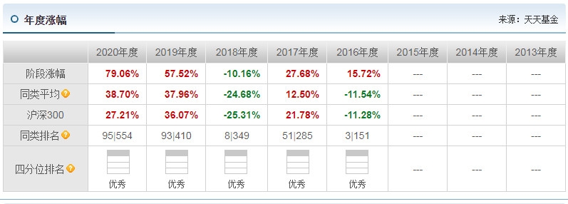 数据显示,基金连续几年都跑赢了沪深300,而且在2020年收益率达到了79.06%,是比较高的水平了,另外2016年是处于熊市阶段,但基金还能获得正收益,说明基金经理在熊市的调整能力是非常不错的。
