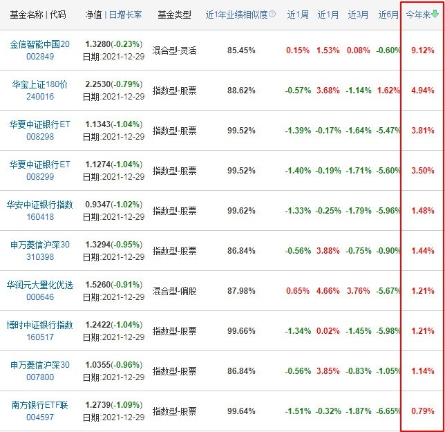 截至2021.12.30,收益前十名的是金信智能中国2025混合、华宝上证180价值联接、华夏中证银行ETF联接A、华夏中证银行ETF联接C、华安中证银行指数、申万菱信沪深300价值指数A、华润元大量化优选混合A、博时中证银行指数(LOF)、申万菱信沪深300价值指数C、南方银行ETF联接A。