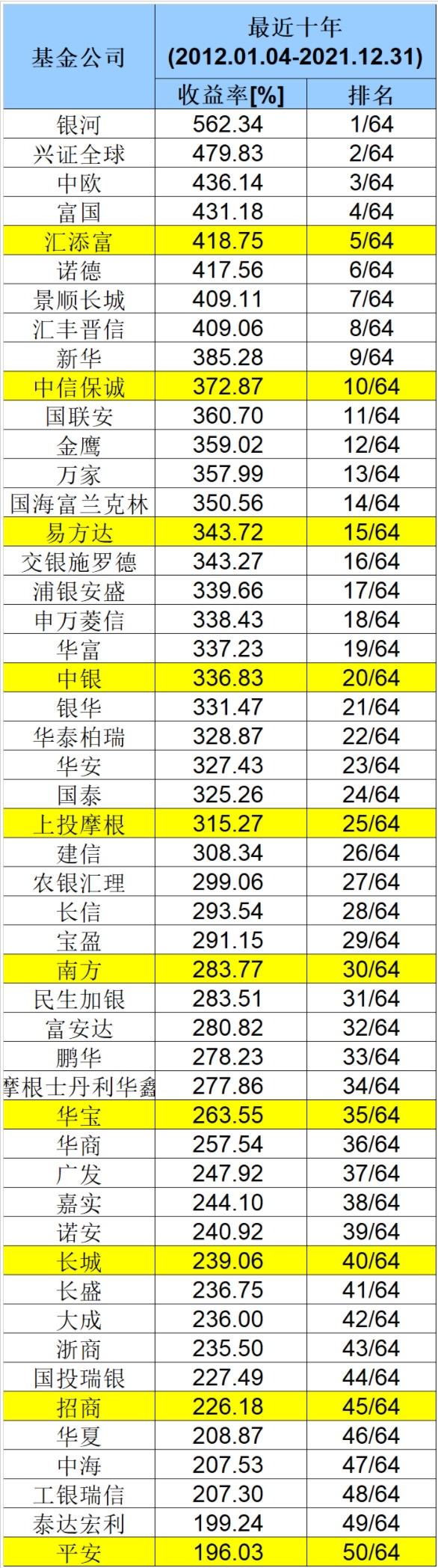 以下是基金公司近十年收益率前五十名: