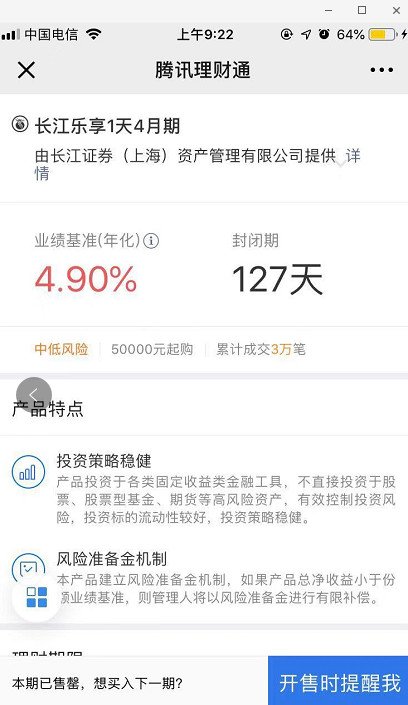 其实券商旗下都有不错的理财产品,只是大家觉得券商都是高风险的,所有有意识的规避了他们的其他产品。今天说的长江乐享1天就是一款不错的,年化收益的为4.9%,期限127天,5万起购的产品。下面一起来看看这款产品怎么样。