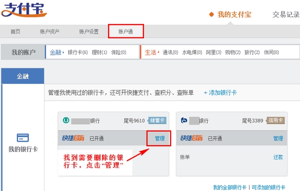 2、输入账号及密码登录支付宝账户后,点击【账户通】,找到需要撤销的储蓄卡银行,点击【管理】。