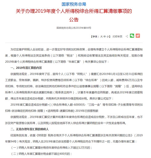 近日,正式开启了个人所得税综合所得汇算清缴,就是通过计算计算2019年度的个人税务情况,实行多退少补的政策。当然对于需要补税金额小于400或总收入低于12万的用户来说是可以免除补税的义务的。那么个人所得税退税的申请标准是怎么样的?一起来了解一下。