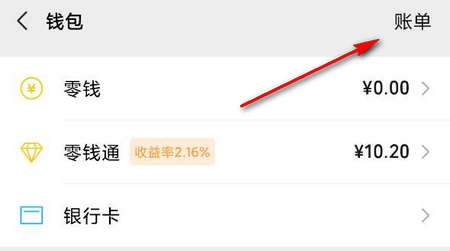 【2】在“钱包”页面点击右上角的“账单”,进入账单查询页面;