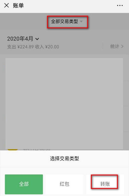【3】点击账单查询页面上方的“全部交易类型”—“转账”,即可筛选出所有的转账记录。