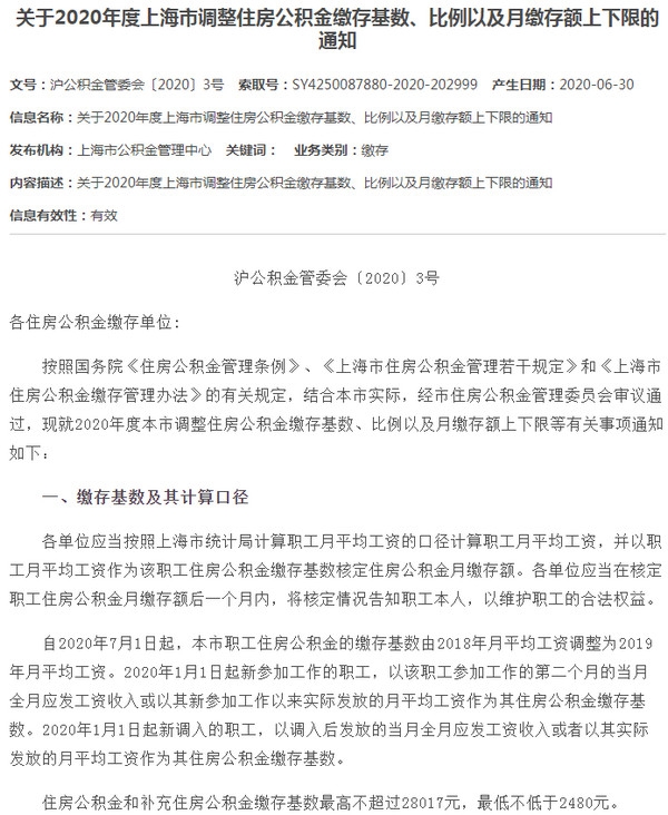 自2020年7月1日起,上海市职工住房公积金的缴存基数由2018年月平均工资调整为2019年月平均工资。