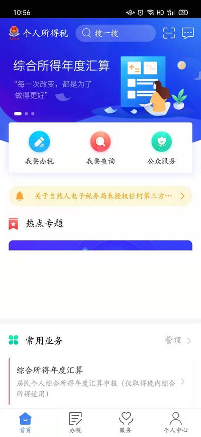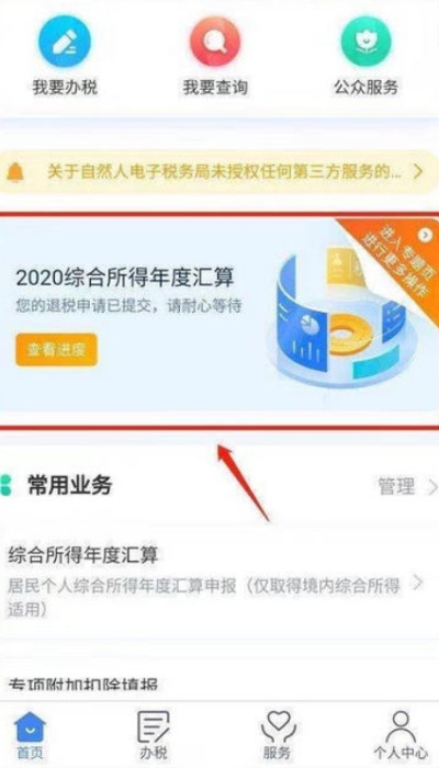 【2】然后直接点击首页中间的【2020综合所得年度汇算】;