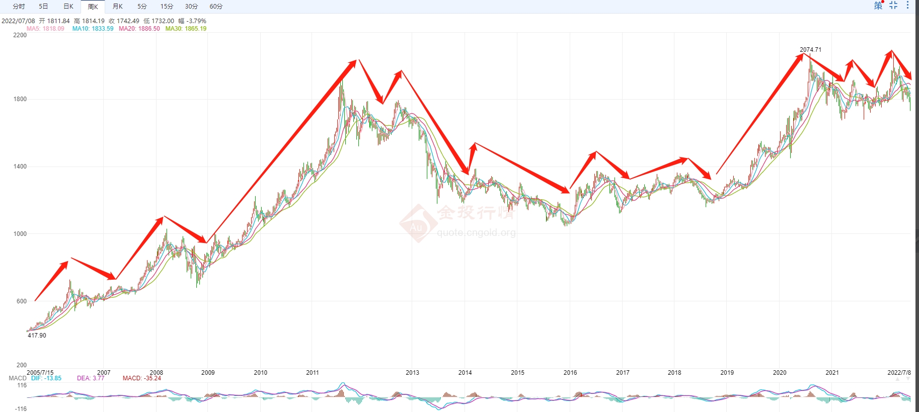 不过,需要提醒大家,黄金的保值增值功能并没有我们印象中那么完美,它也是会随着市场行情而波动的,比如下图国际金价的变化中,我们可以看到如果行情不佳,黄金的投资也可能面临严重亏损。