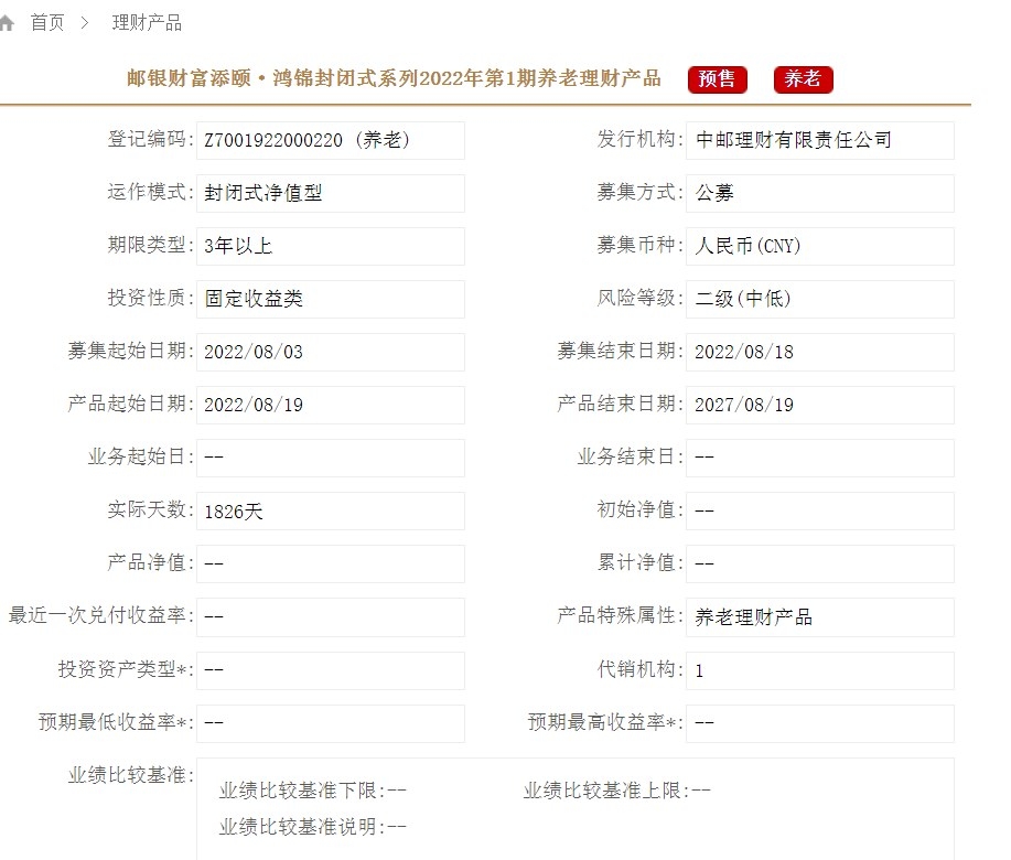 邮银财富添颐·鸿锦封闭式系列2022年第1期养老理财产品属于固定收益类PR2中低风险产品,期限为5年,发行额度为30亿元,将在北京、上海、广州、深圳、武汉、重庆、成都、长春、沈阳、青岛10个试点城市发行,客户需要持有发行范围地区的身份证方可以购买。
