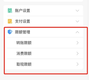 ④找到限额管理,选择需要解除的限额类型,然后直接调整银行卡的限额就可以了。