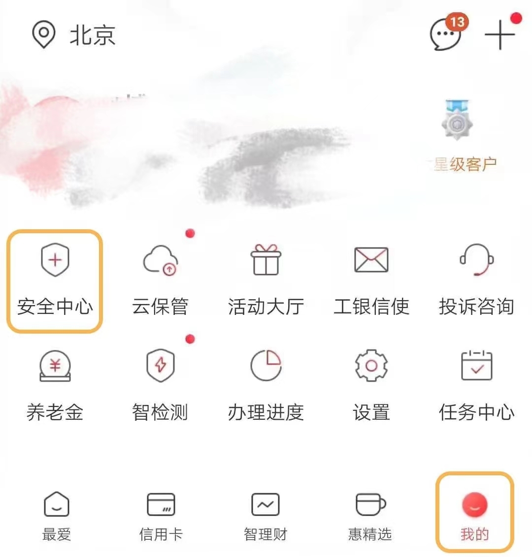 1、用户点击手机银行“我的-安全中心”;