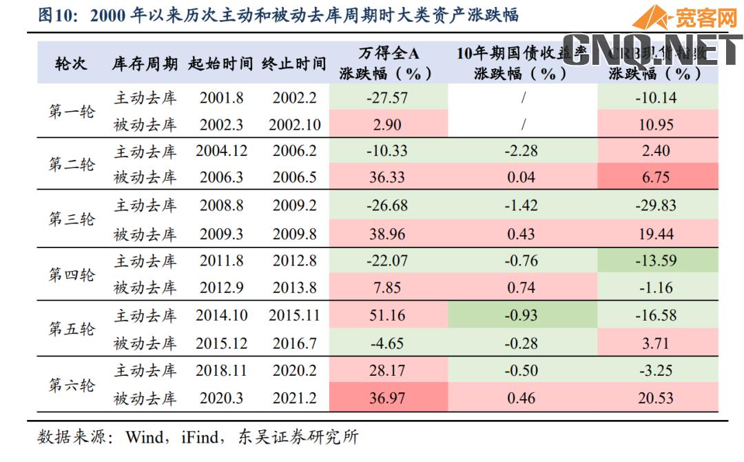 库存周期在一定程度上代表了经济景气度,也与资产价格的走势息息相关。通过对历史的复盘,我们发现当库存周期从主动去库过渡到被动去库后,股市涨势会更加显著、10年期国债收益率逐渐步入企稳、商品价格上行趋势显现。
