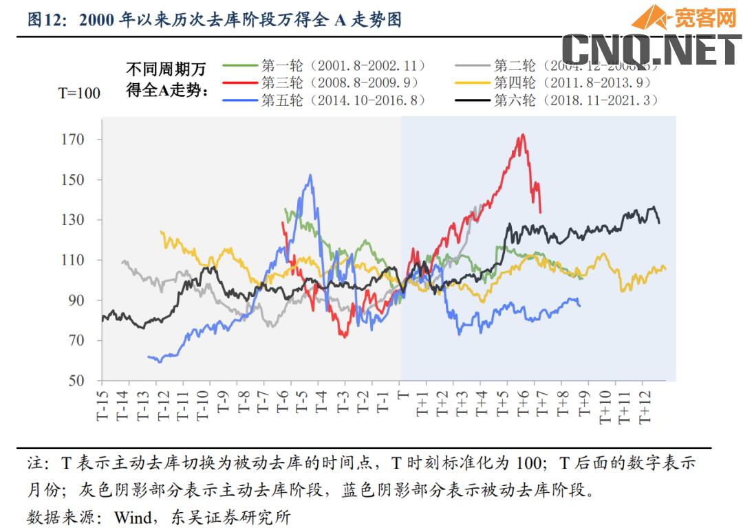 被动去库阶段迎来股市涨幅。主动去库对应着经济的下行压力较大(政策效力不足或者尚未完全体现),股市表现比较消极。而当库存周期步入被动去库阶段之后,宏观经济景气度的上行也为股市的企稳反弹提供了经济和心理的基础。结合图12来看,在大多数库存周期中,被动去库的到来与万得全A的上涨几乎“如影随形”。