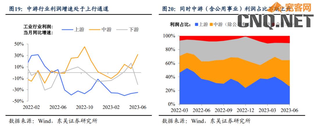 从公用事业板块来看,疫后工业的复工复产带动能源需求的提升。同时公用事业板块的利润通常由煤炭(投入)和电力(产出)的相对价格决定:基于现在煤价下跌、电价上涨的情形,公用事业行业盈利从中受益。从中游装备制造业来看,得益于国家对高科技制造业和新能源行业的政策支持,目前中游装备制造业(尤其是通用设备、专用设备、电气机械、运输设备等领域)利润增速表现亮眼,剔除公用事业后的中游利润占比同样处在上行通道。