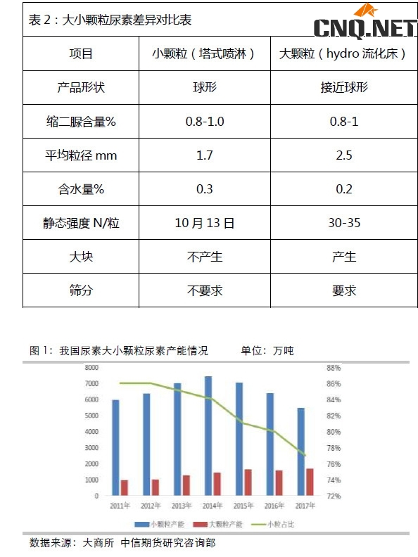 2. 粒径1.5MM左右为小颗粒,2-4.75MM为大颗粒,7mm以上为尿素丸,大颗粒是在小颗粒基础上二次造粒,小颗粒产能80%左右,但近几年占比持续下滑。另外,最新的交易规则规定,交割标的为中小颗粒优等品,合格品设置20元/吨的贴水交割,大颗粒不允许交割。如下表所示: