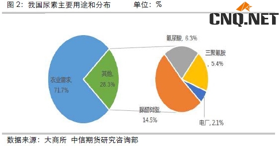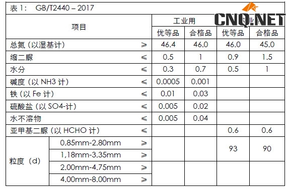 3. 尿素的用途有工业用(脲醛树脂、三聚氰胺、车用尿素和火电脱硝等)和农业用(直接施用、复合肥),其中工业用的指标要求好于农业。如下图所示: