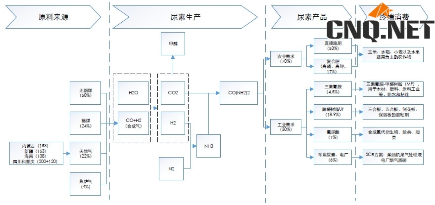 尿素有三大原料,跟甲醇类似,74%的来自于煤炭,22%来自于天然气,另外少量的来自于焦炉气,其中煤炭来源中,50%是无烟煤,烟煤和褐煤占比24%,从趋势上看,烟煤和褐煤的占比有望逐步扩大;第二个环节是合成氨的合成,这里面会有氨醇比的问题,甲醇和合成氨之间会有个适度调节的问题,这里面取决于利润相差是否大,然后合成氨(NH3)再和CO2反应制取尿素CO(NH2)2;继续延升就到了产品环节,农业上可以直接施用,也可以跟磷、钾制作复合肥,另外就是工业上制取三聚氰胺、脲醛树脂,第三就是环保需求,比如车用尿素和电厂脱销,从占比上农业用需求能占到70%,其中直接施用占比53%,复合肥占比17%,工业用主要是脲醛树脂做胶粘剂;最后从终端去看,农业需求主要是农作物的种植(如玉米、水稻、小麦以及蔬菜水果等),工业用主要跟房地产关联,如房屋装修以及柴油汽车。如下图所示: