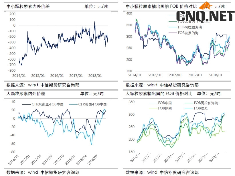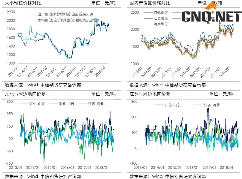 其次我们看内外价格和地区间的价差,尿素是全球性供需的商品,贸易网遍布全球,而价差跟贸易流之间是相互作用的,而两个价差分别影响了进出口和转口贸易行为,进而影响到国内尿素的价格,具体如下图所示: