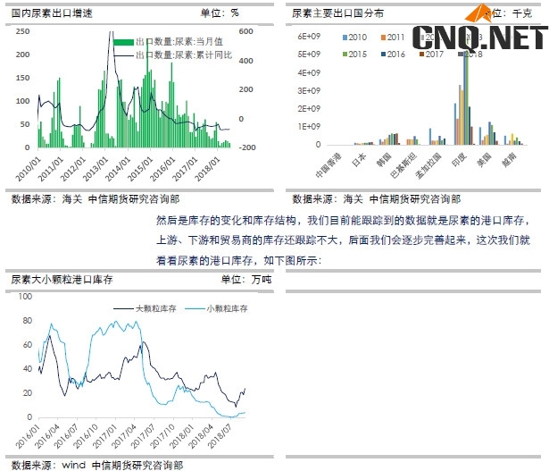 另外从进出口去看,尿素的进口量处于非常低的水平,这跟国内产能过剩是有明显关系的,而出口量的话波动比较大,出口地主要是印度,美国也有一部分,具体如下图所示:
