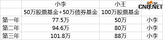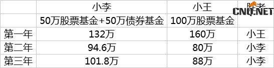 小王在第1年大幅胜出,但如果把投资时间拉长到2年、3年,胜出的还是小李。这就是不同资产配置的区别。