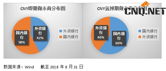 据央行二季度货币政策执行报告,截至2018年6 月末银行间外汇市场共有即期市场会员667 家,远期、外汇掉期、货币掉期和期权市场会员分别为203 家、199 家、167 家和119 家,即期市场做市商32 家,远掉期市场做市商27 家。据Wind,截止2018年8月31日,人民币外汇即期做市商发展到33家,远掉期市场做市商增加至30家。