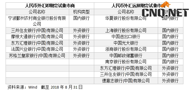 人民币外汇即期尝试做市商共6家,远掉期尝试做市商10家,外币对做市商16家。