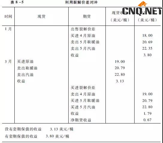 该炼油商在期货市场上进行了平仓。以54.29美分/加仑以及49.50美分/加仑的价格分别买进汽油和取暖油,以19美元/桶的价格卖出原油,整个卖出裂解价差头寸的收益为67美分/加仑。如果该炼油商没有套期保值,他的收益仅限于3.13美元/桶,实际上,他的收益为3.13+0.67=3.80美元/桶,这与他当初的设想完全一致。操作见表8-5。